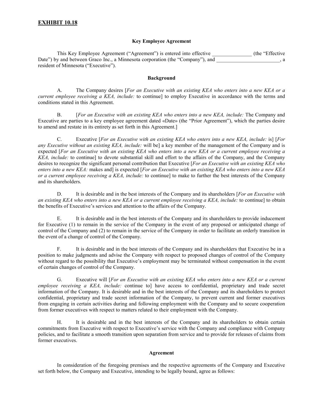| *10.6 | | Graco Restoration Plan (2005 Statement). (Incorporated by reference to Exhibit 10.1 to the Company’s Report on Form 10-Q for the thirteen weeks ended September 29, 2006.) First Amendment adopted December 8, 2006. (Incorporated by reference to Exhibit 10.12 to the Company’s 2006 Annual Report on Form 10-K.) Second Amendment adopted August 15, 2007. (Incorporated by reference to Exhibit 10.1 to the Company’s Report on Form 10-Q for the thirteen weeks ended September 28, 2007.) Third Amendment adopted March 27, 2008. (Incorporated by reference to Exhibit 10.1 to the Company’s Report on Form 10-Q for the thirteen weeks ended March 28, 2008.) Fourth Amendment adopted December 29, 2008. (Incorporated by reference to Exhibit 10.11 to the Company’s 2008 Annual Report on Form 10-K.) Fifth Amendment adopted September 16, 2010. (Incorporated by reference to Exhibit 10.1 to the Company’s Report on Form 10-Q for the thirteen weeks ended September 24, 2010.) Sixth Amendment adopted February 15, 2018 (Incorporated by reference to Exhibit 10.7 to the Company’s 2017 Annual Report on Form 10-K.) Seventh Amendment adopted December 6, 2018. (Incorporated by reference to Exhibit 10.6 to the Company’s 2018 Annual Report on Form 10-K.) |