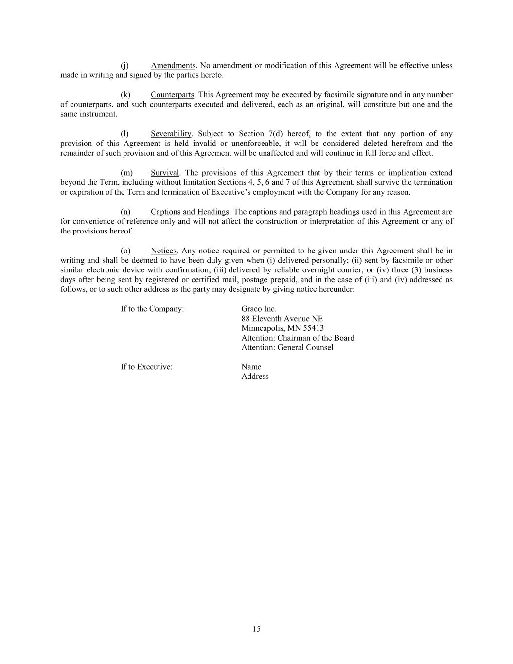 | Investors may obtain access free of charge to the Graco Inc. Annual Report on Form 10-K, quarterly reports on Form 10-Q, current reports on Form 8-K, other reports and amendments to the reports by visiting the Graco website at www.graco.com. These reports will be available as soon as reasonably practicable following electronic filing with, or furnishing to, the Securities and Exchange Commission. |